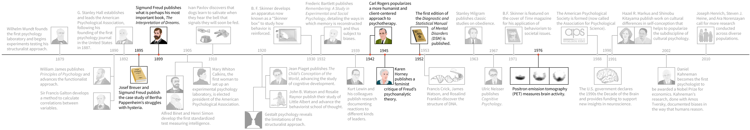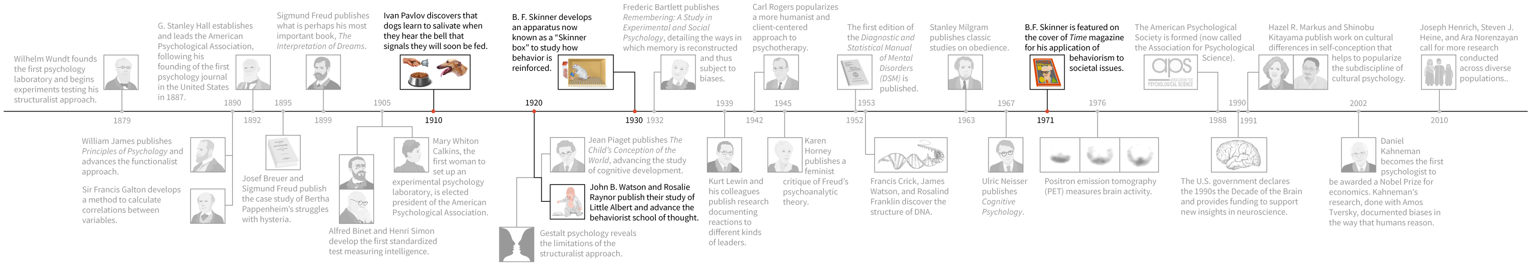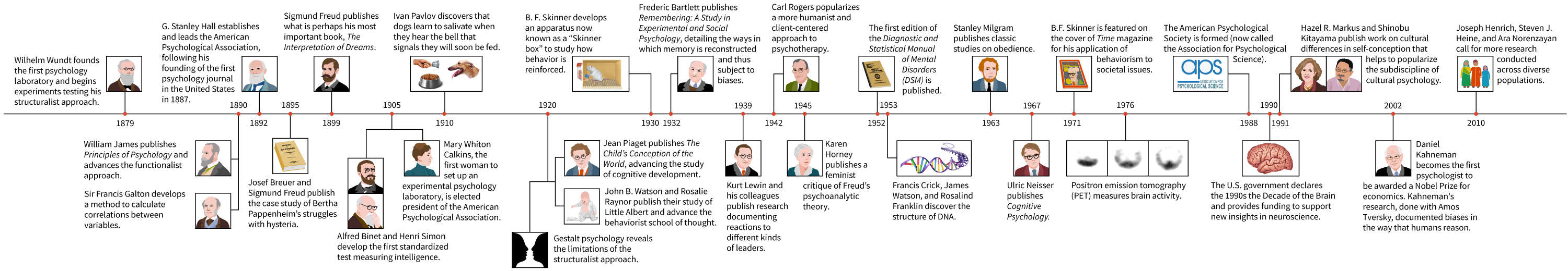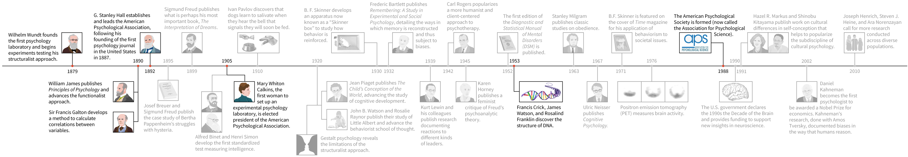 Though humans have been thinking about their minds and behavior for millennia, the field of psychology as a science is less than 150 years old. But those years have been quite eventful! Select “Next” to view a timeline containing some of the highlights.